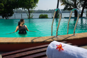 Surrounded by flowering plants, coconut palms, and ambient lighting in the evening, it’s the perfect place for reading, sunbathing, or stargazing. It’s no wonder that guests rave about this resort in Cherai with pool—it provides not just a leisure spot, but a deeply relaxing experience.
